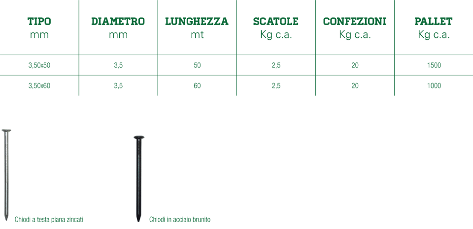 Chiodi in ferro o zincati, a testa piana forniti in comode scatole di cartone per uso edilizio.