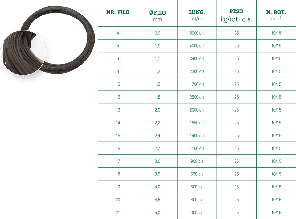 Prodotto nei diametri da 0,90 a 5,0 mm, commercializzato in matasse da 25 Kg, trova applicazione in diversi settori, dall’edilizia all’industria e nell’agricoltura. Resistenza e duttilità son le caratteristiche principali del filo cotto nero, determinate dal trattamento termico che segue il processo di trafilatura; ciò consente una manipolazione agevole del prodotto che viene principalmente adoperato come elemento di legatura.