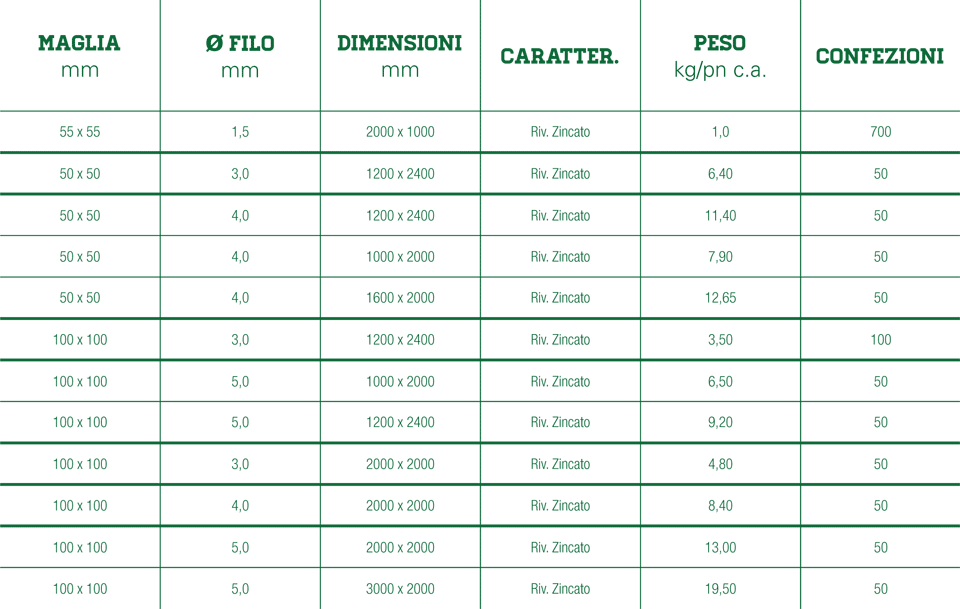 I pannelli di rete elettrosaldata in filo zincato, sono prodotti in svariati formati sia di maglie sia di dimensioni e realizzati in differenti diametri di filo.