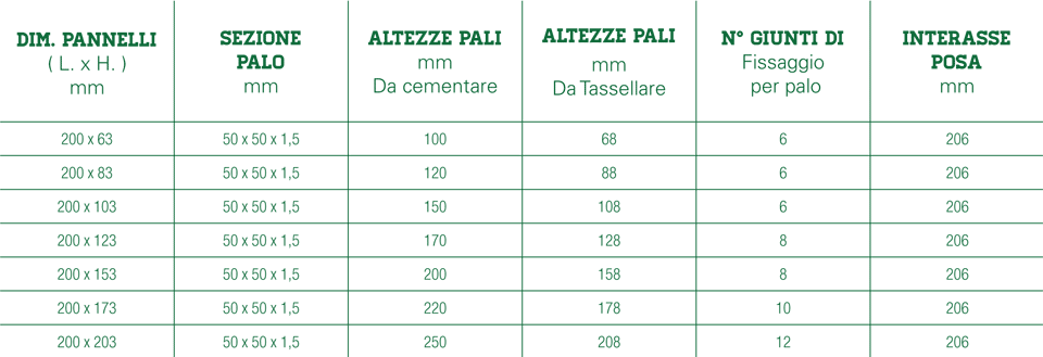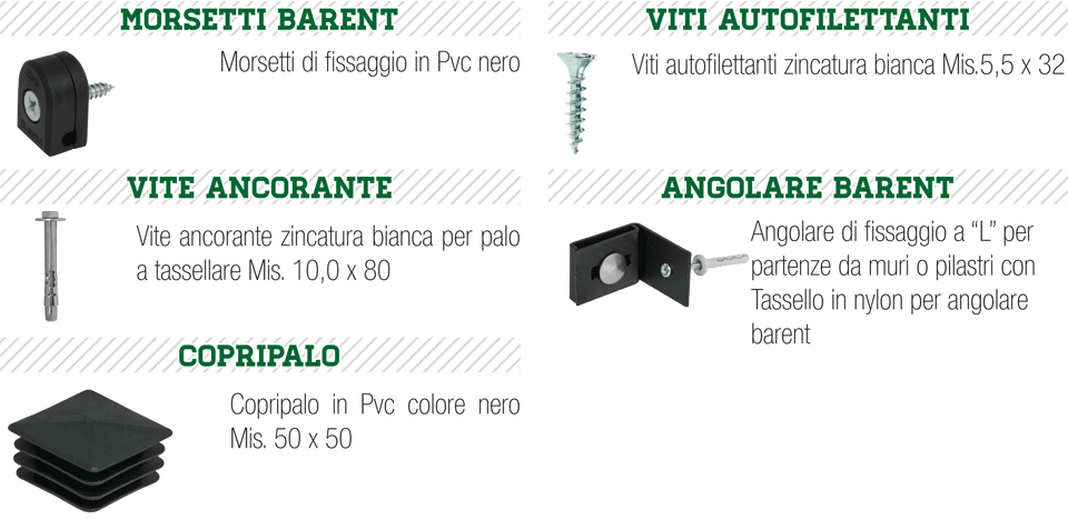 Per la posa in opera della Fence Barent, vengono utilizzati pali di sezione quadrata da 50x50x1.5 mm, zincati e verniciati, nella versione a cementare o con piastra a tassellare; dotati di inserti filettati per il fissaggio dei pannelli, e di copripalo in Pvc.