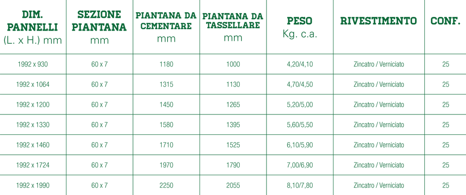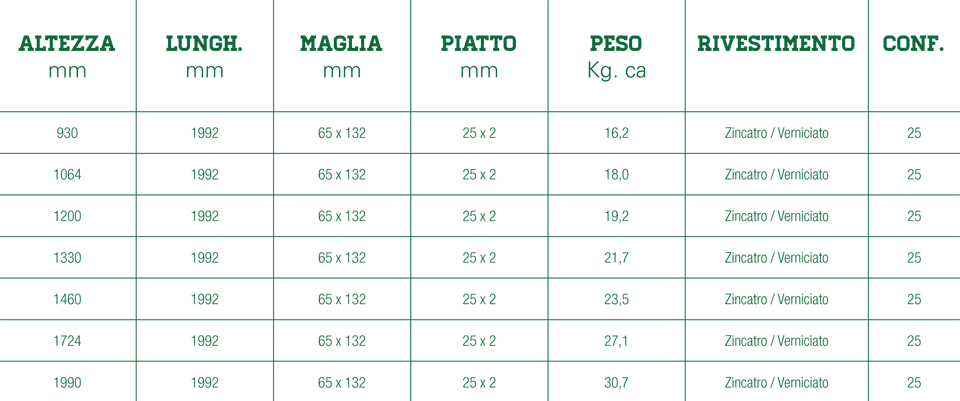Pannelli di recinzione modulare in grigliato bordato ed elettrosaldato, composto da barre verticali portanti a maglia rettangolare mm 65 x 132 e da barre orizzontali di collegamento a sezione tonda da 5,0 mm. I pannelli vengono prodotti in svariate altezze, nella versione zincato a caldo conforme alle norme UNI EN ISO 1461:1999, oppure zincati e verniciati. Per l’installazione sono utilizzate piantane realizzate in piatto d’acciaio sezione 60 x 7 mm con testa arrotondata, disponibili nella versione da tassellare o da cementare. I pannelli vengono fissati alle piantane mediante l’uso di appositi bulloni in acciaio inox M8 x 30 a testa tonda con dado esagonale o con dado antifurto. Le recinzioni in grigliato sono particolarmente robuste e resistenti nel tempo, per questo particolarmente indicate per la recinzione di aree industriali.