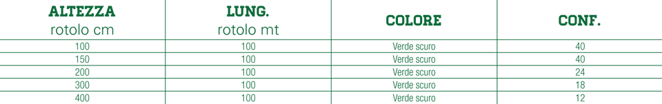 Rete tessuta a maglia fitta, frangivista, fornita in rotoli, colore verde scuro con asole alle cimose, di varia utilità impiegata sia in campo edile sia privato.