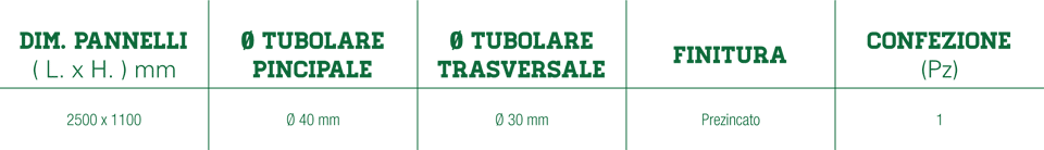 Realizzata con tubolare prezincato da 40 mm e da 30 mm con tondini verticali in ferro Ø. 8 mm. Completa di piedini di sostegno fissi o mobili.